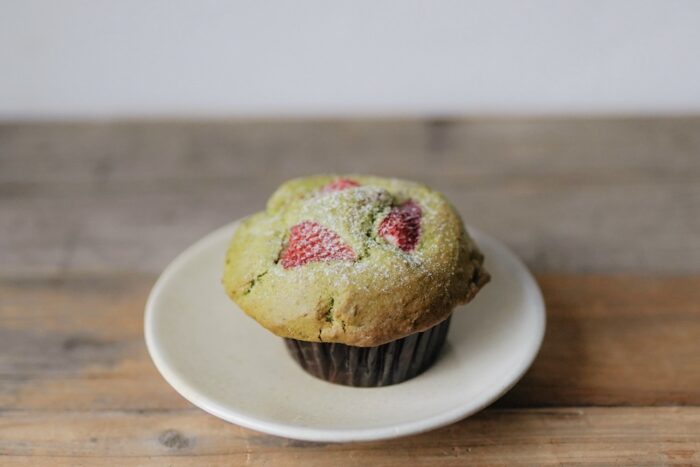 奈良|大和園さんの抹茶を使用した生地に、自家製の苺ジャムと苺を詰め込み、上にも苺を乗せて焼き上げました。まるで草原に花が咲くような情景の、春色をしたマフィンです。